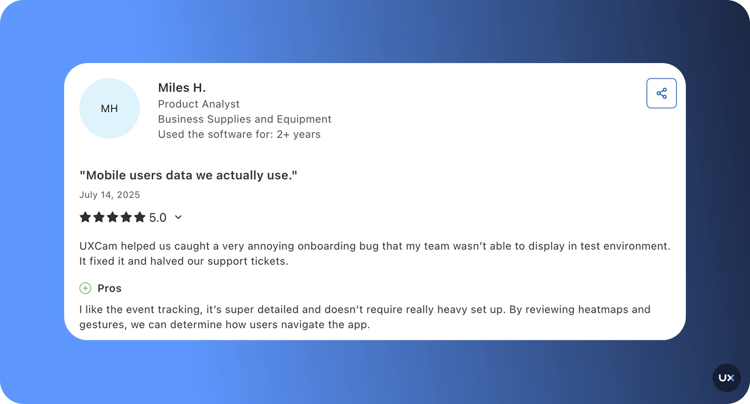 UXCam helps you understand what users do, and why they do it, so you can deliver experiences that drive growth across both mobile and web platforms. It’s the best product analytics tool for teams that want complete behavioral visibility, not just metrics.