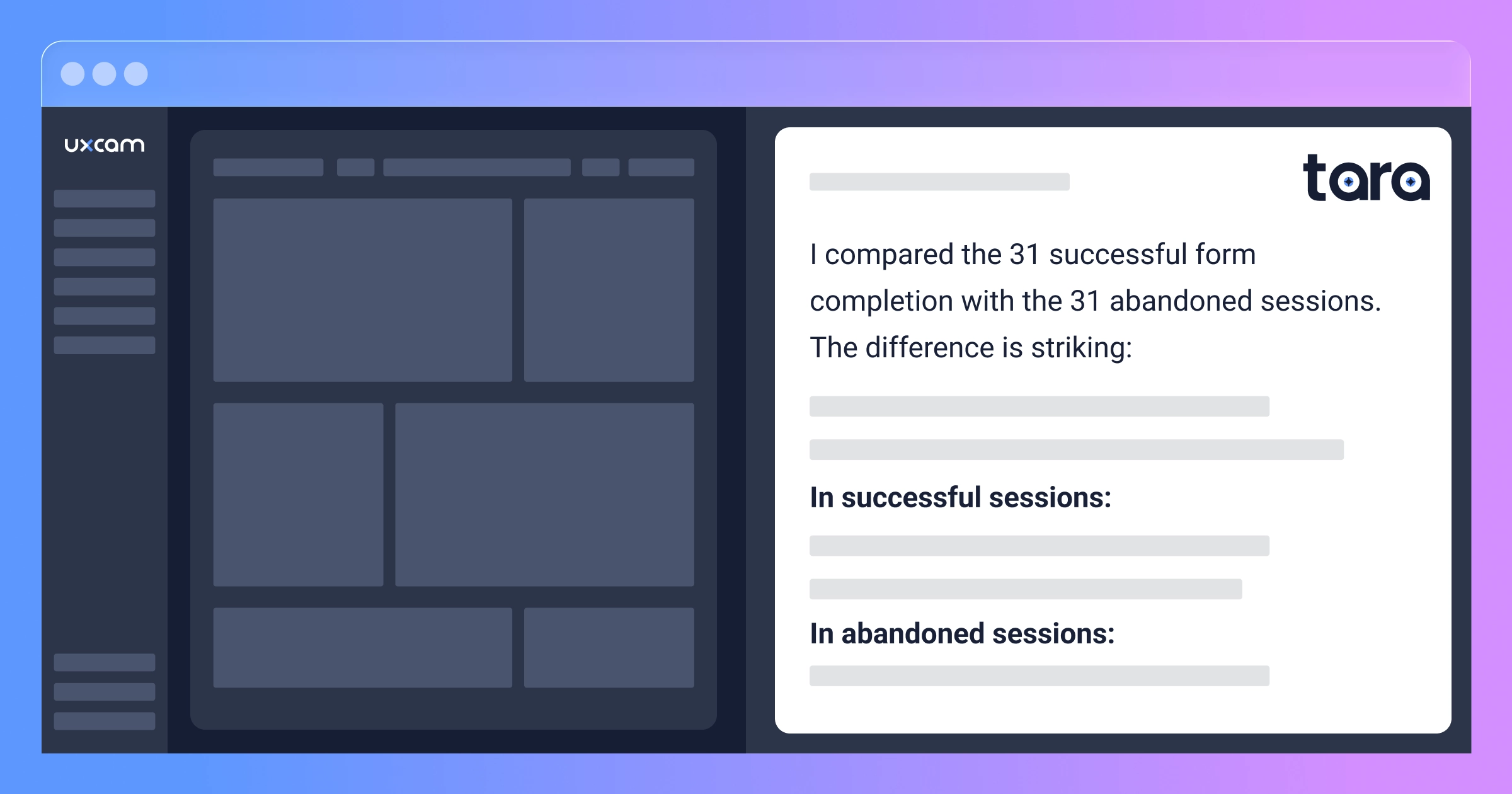 Instead of manually scrubbing through hundreds of sessions, ask Tara to do the analysis. She watches recordings frame by frame, the same way a human analyst would, but across dozens of sessions in minutes instead of weeks.