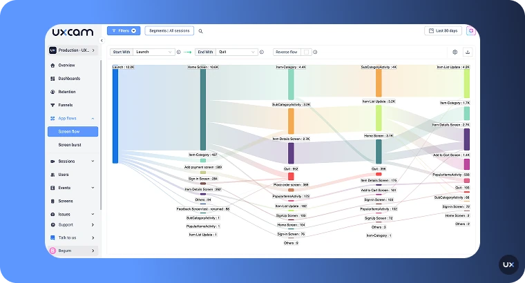 UXCam helps Flutter teams connect event data to real user behavior by adding visual context to analytics. You can see how users interact with widgets, how flows break down, and where friction appears, without relying on platform-native assumptions or duplicating effort across iOS and Android.