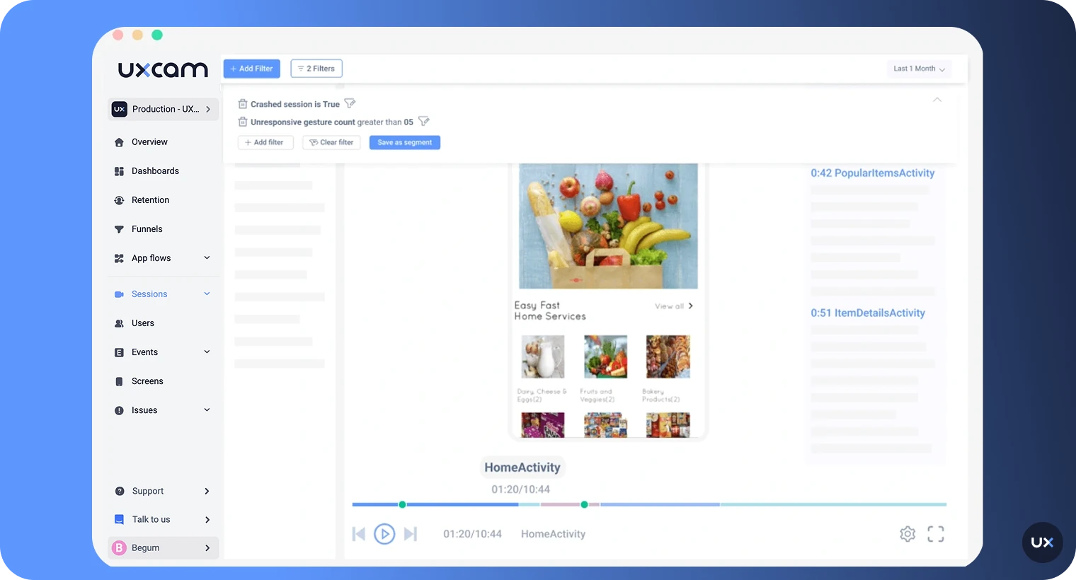 Explore and customize: Use the UXCam dashboard to view replays, configure masking, set up custom events, and refine filters.