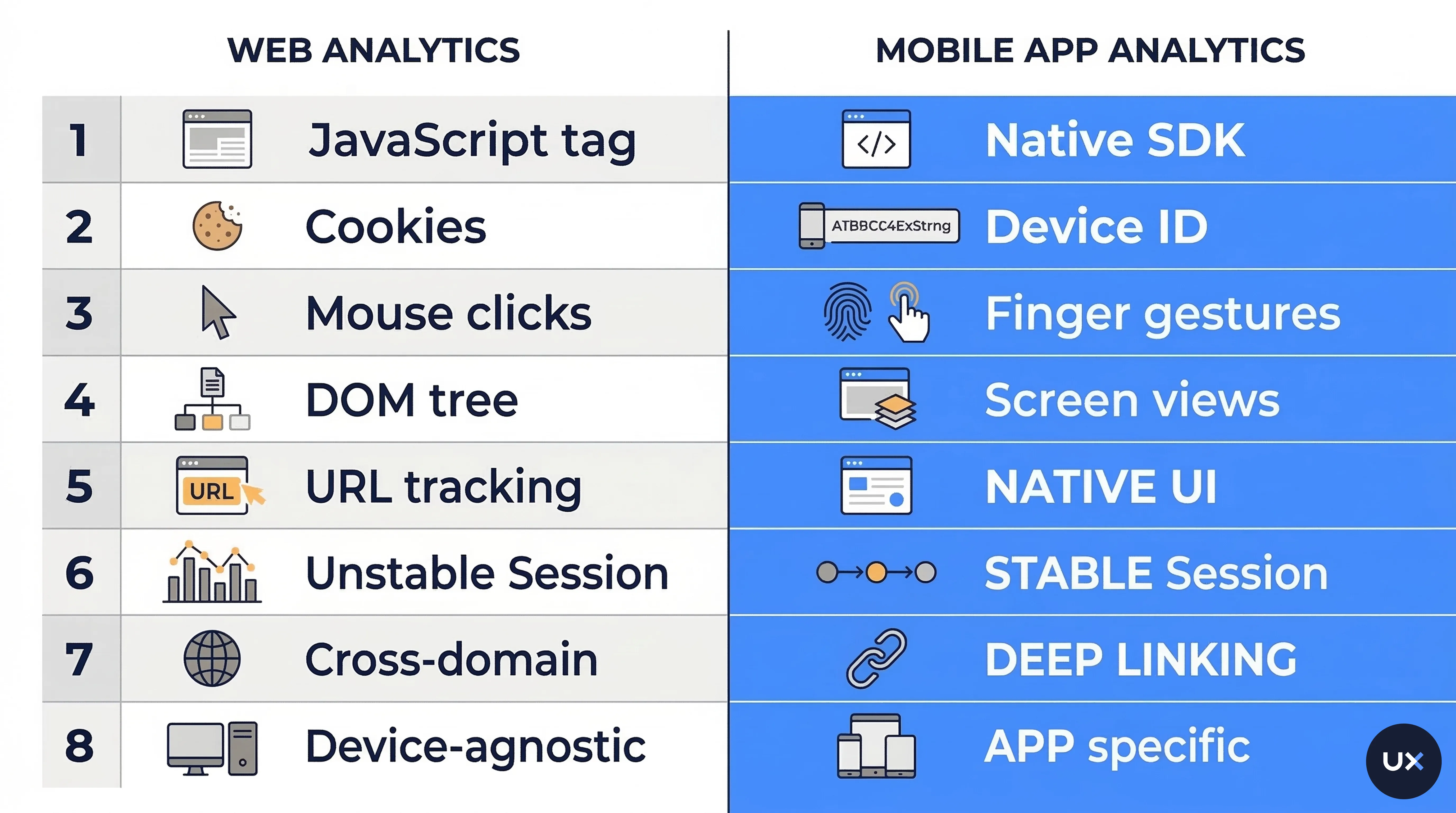 | Data collection | JavaScript snippet injected into HTML | Native SDK compiled into the app binary |