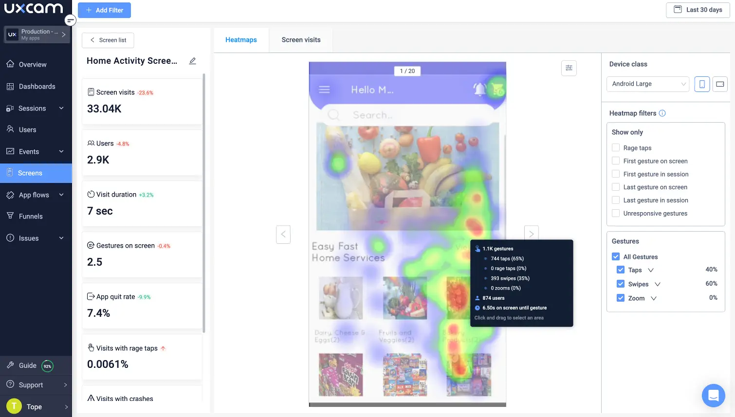 Heatmaps: Our heatmaps visually represent where users tap, swipe, and interact with the app. This can highlight the most and least popular features and provide context for product engagement metrics like stickiness ratio and churn rate.