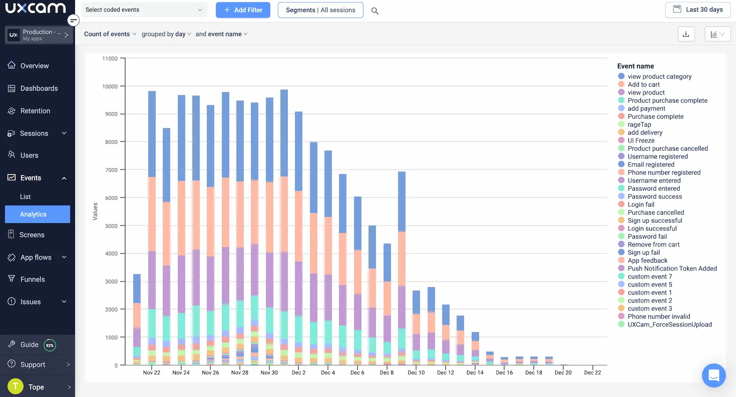 Event tracking: UXCam allows custom events to be tracked within the app, enabling product managers to analyze how users engage with specific features and measure the impact of changes.