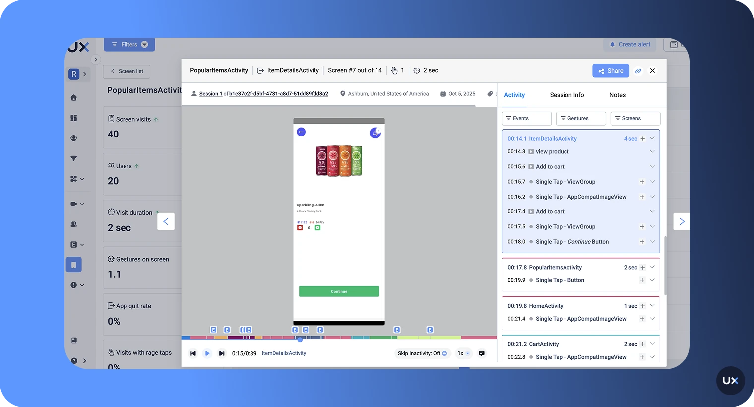 Advanced session replay: Visualize user interactions with high-fidelity session recordings. These replays show exactly how users navigate your app, where they hesitate, and what actions they take. This feature is invaluable for understanding user behavior and identifying usability issues.