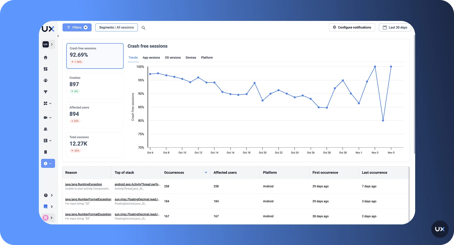 Comprehensive crash analytics: Quickly identify and diagnose crashes with detailed reports. UXCam provides stack traces, device information, and user steps leading up to a crash. This comprehensive data helps you resolve issues faster and improve app stability.