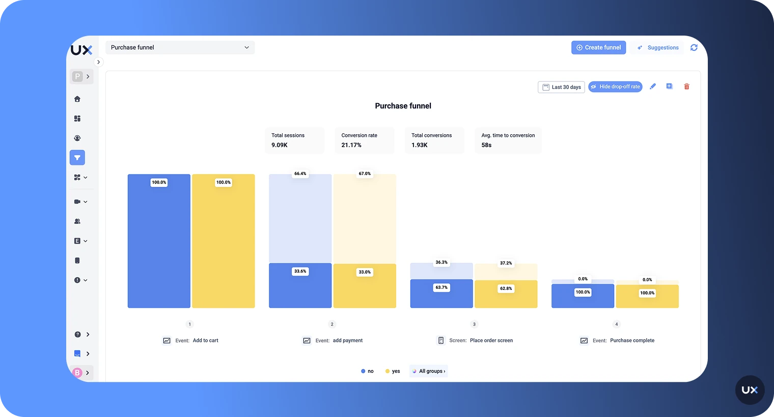 Funnel analysis: With UXCam's funnel analytics, you can visualize user progression through critical conversion paths within their app. By creating custom funnels, you can identify drop-off points and bottlenecks, analyze performance across different user segments, and drill down into individual sessions. This insight helps optimize the user experience and improve conversion rates by pinpointing areas that need enhancement.