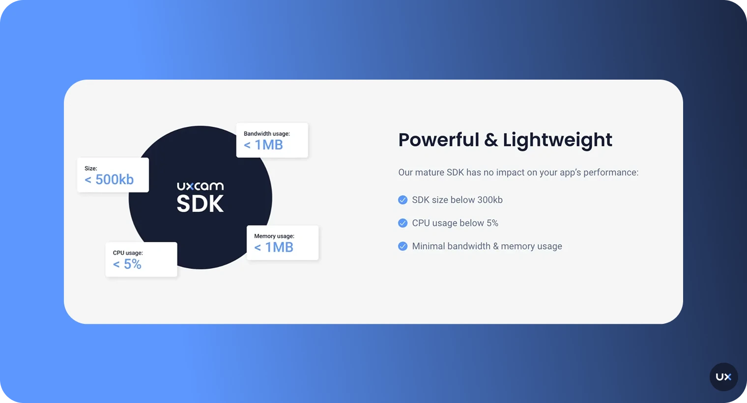 React Native expertise: UXCam's team understands the unique challenges of React Native development. Their SDK is optimized for React Native, ensuring accurate data collection without impacting app performance.