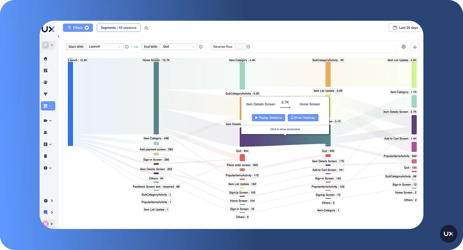 User journey analysis: UXCam's user journey analytics provides a comprehensive view of how users navigate through your app. You can visualize common user paths, uncover unexpected behaviors, and analyze screen flows to optimize navigation. By understanding user journeys, you can make informed decisions about feature prioritization and UI/UX improvements, ultimately enhancing the overall user experience.