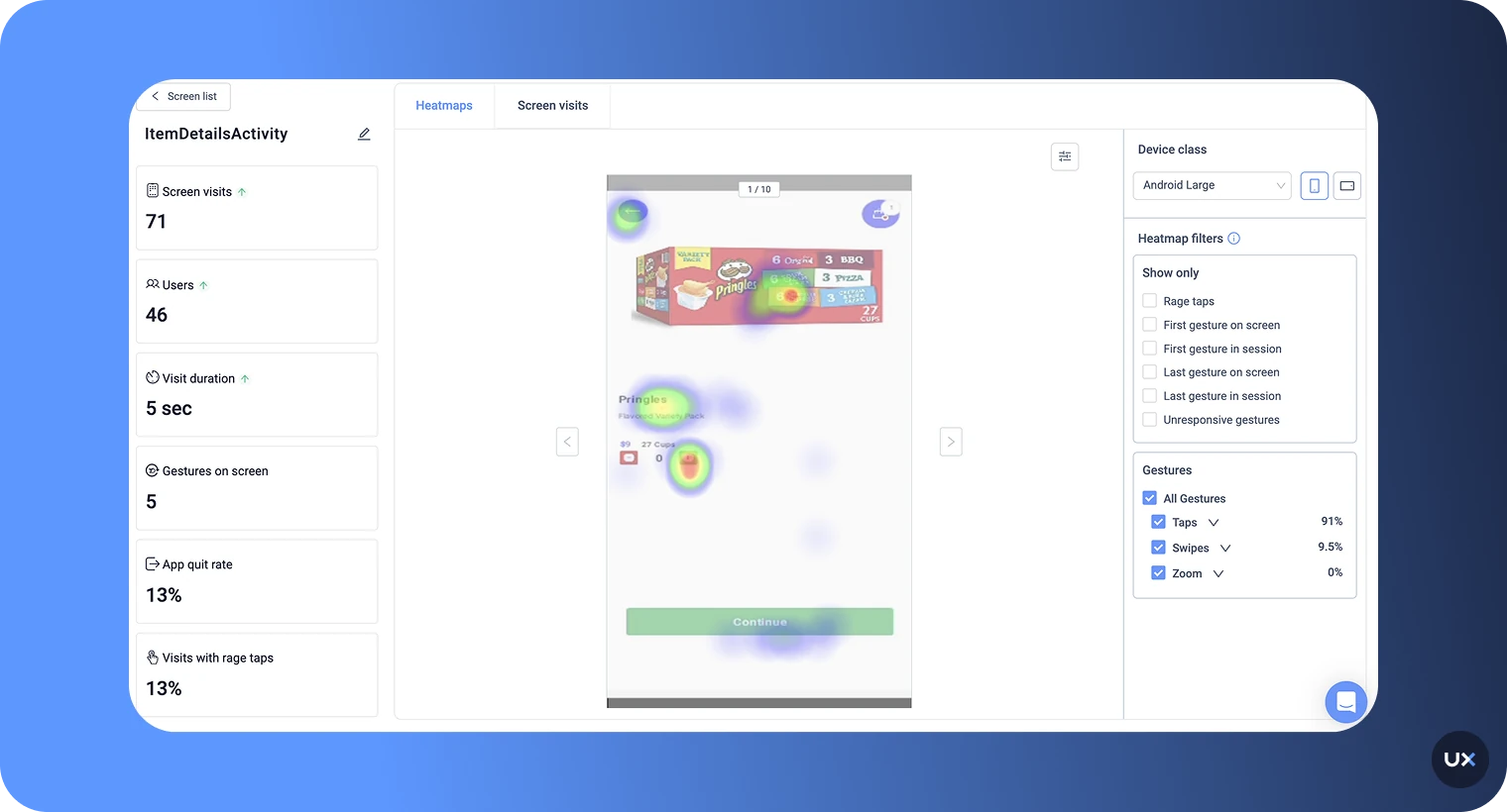 Heatmaps: Visualize taps, scrolls, and gestures instantly to enhance individual screens and features.