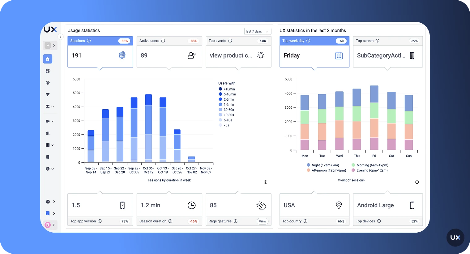 User-friendly interface: UXCam's dashboard is intuitive and easy to navigate. You don't need to be a data scientist to understand the insights provided. Clear visualizations and actionable reports make it easy to derive value from your analytics data.