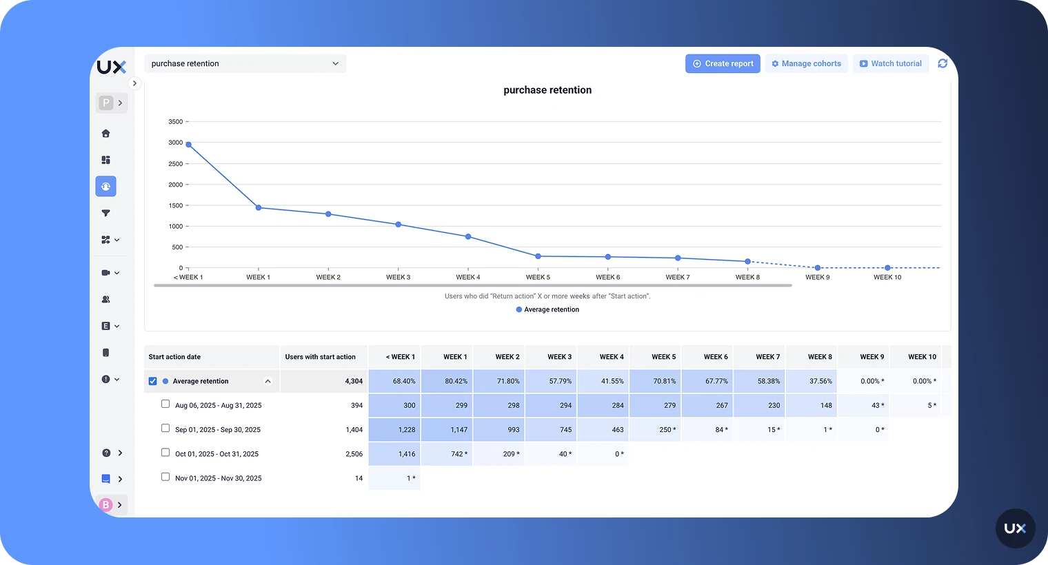Retention and cohort analysis: With UXCam's retention and cohort analytics, you can gain insights into user engagement and loyalty over time. This feature allows you to track retention rates, create custom cohorts based on user behaviors, and compare retention across different segments. By identifying trends and early signs of churn, you can develop targeted strategies to enhance user retention and maximize the lifetime value of your app users.