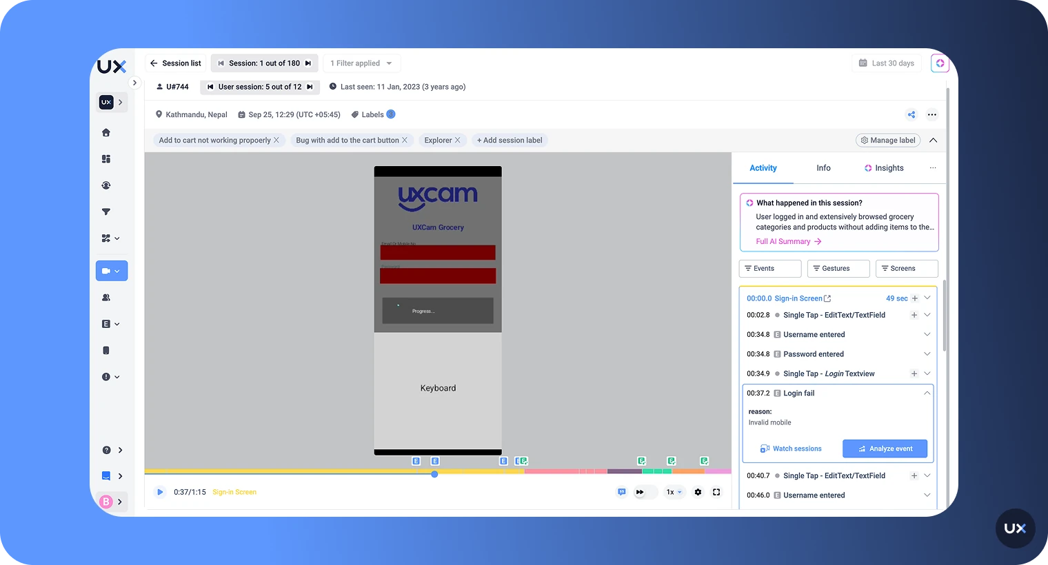 UXCam contextualizes performance problems by showing how users actually experience lag or slow screens. When your monitoring dashboard reports a spike in slow screen loads, UXCam's session replay reveals what users were doing when the lag occurred. You can watch the exact gestures, screen transitions, and interactions that triggered the delay.