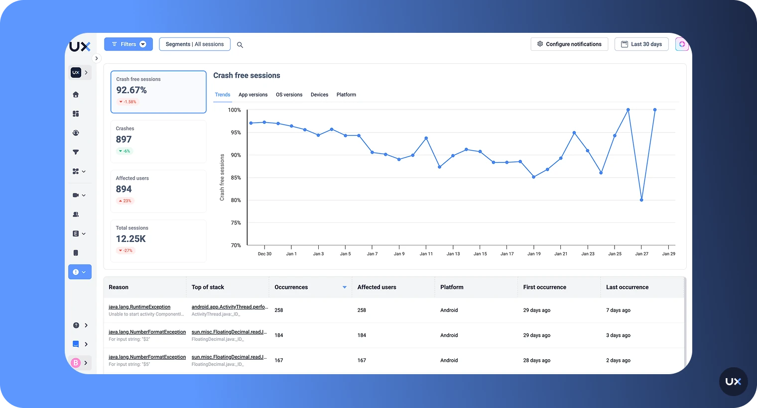 Analyze handled exceptions to identify user experience impact With UXCam, you can log the exceptions that were caught in your React Native app to aid in debugging and gain insights into how these exceptions impact the user experience and app performance.