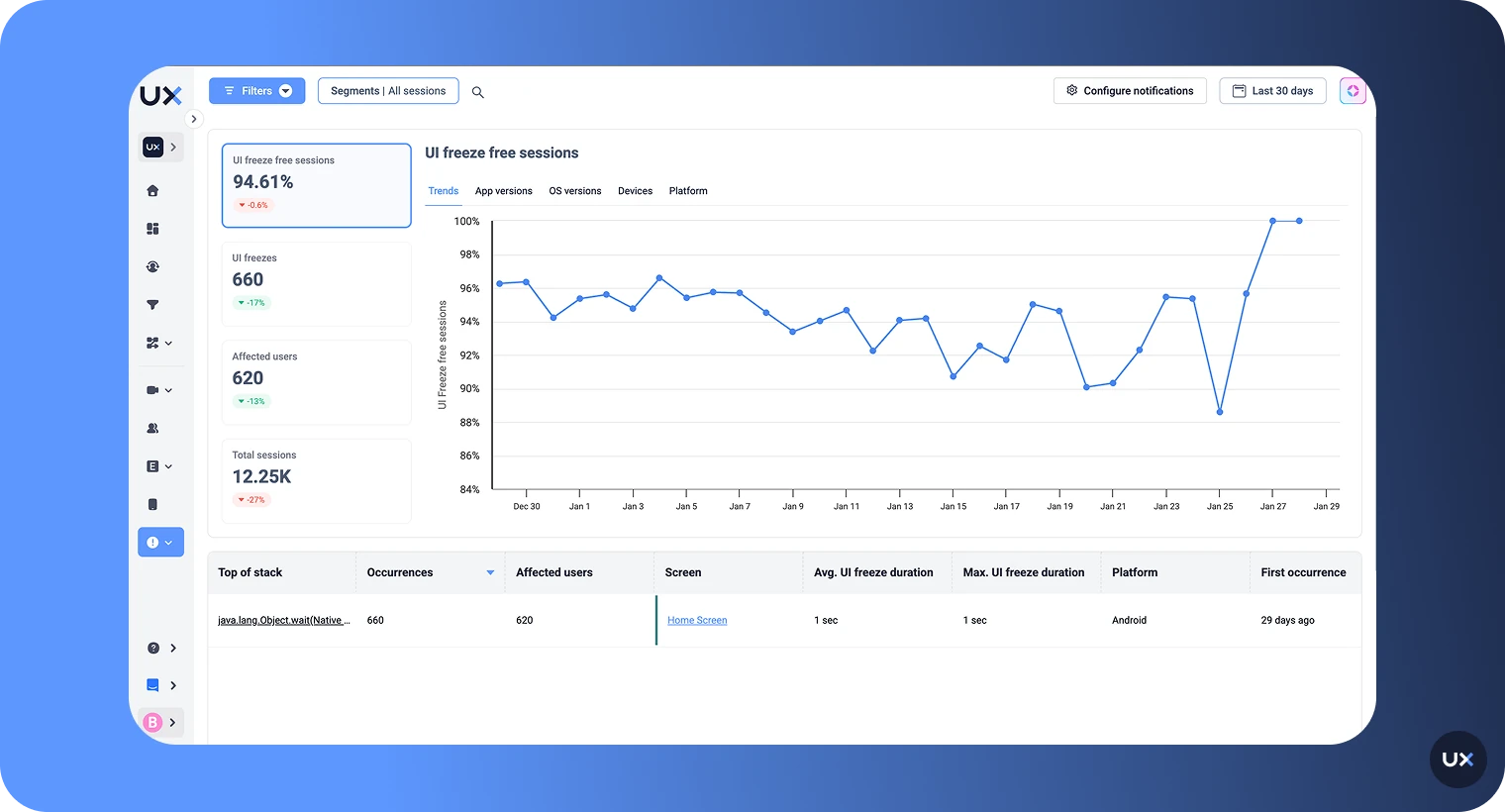 UXCam helps connect low-level performance signals to real user behavior. By showing how performance issues appear inside actual user sessions, teams can see where lag impacts key flows and which interactions are affected across devices and platforms.