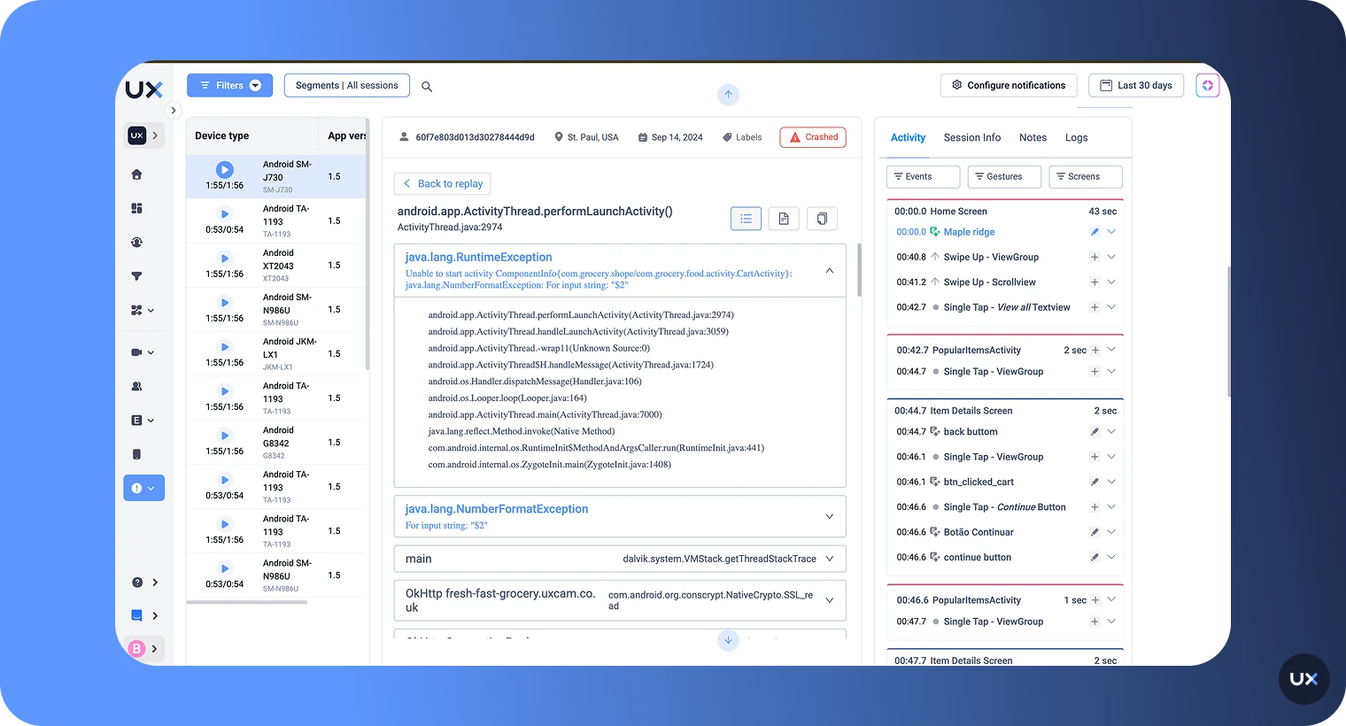 With app logs and session replay, you can analyze the exception, understand which interaction in the app caused it, and determine its impact on your app and features. By doing so, your dev team can handle these exceptions more gracefully, improving the overall user experience and app performance.
