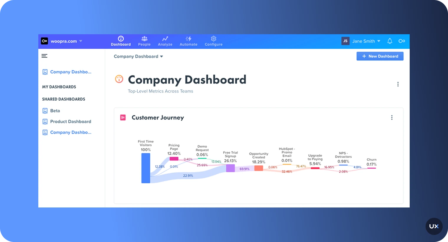Woopra specializes in real-time customer journey analytics. It gives you a detailed view of the user journey across multiple touchpoints, enhancing website optimization. With its robust analytics suite, Woopra enables businesses to personalize interactions and drive engagement. Key features include detailed retention and trend reports, enabling you to understand user behavior over time and make data-driven decisions.