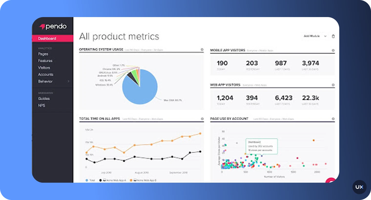 Pendo is a product experience platform that helps you see how customers and employees use your software across web, mobile, and desktop. It lets you track feature usage and user journeys, gather feedback through surveys, and deliver in-app guides to boost onboarding and adoption.