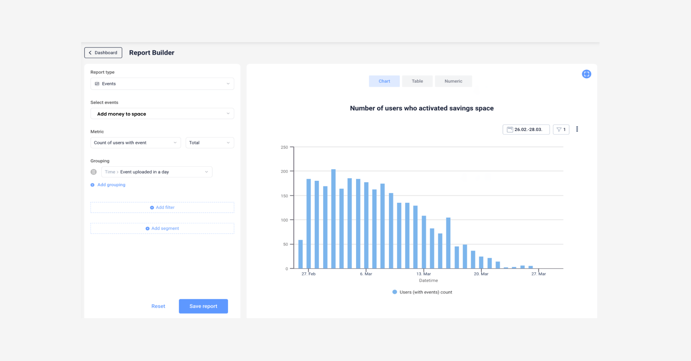 Acompanhe facilmente seus usuários ativos diários e mensais com a UXCam Em seguida, você pode medir quantos usuários reagiram à notificação push e realizaram a ação "adicionar dinheiro à poupança". Para fazer isso na UXCam, você precisará configurar eventos personalizados.
