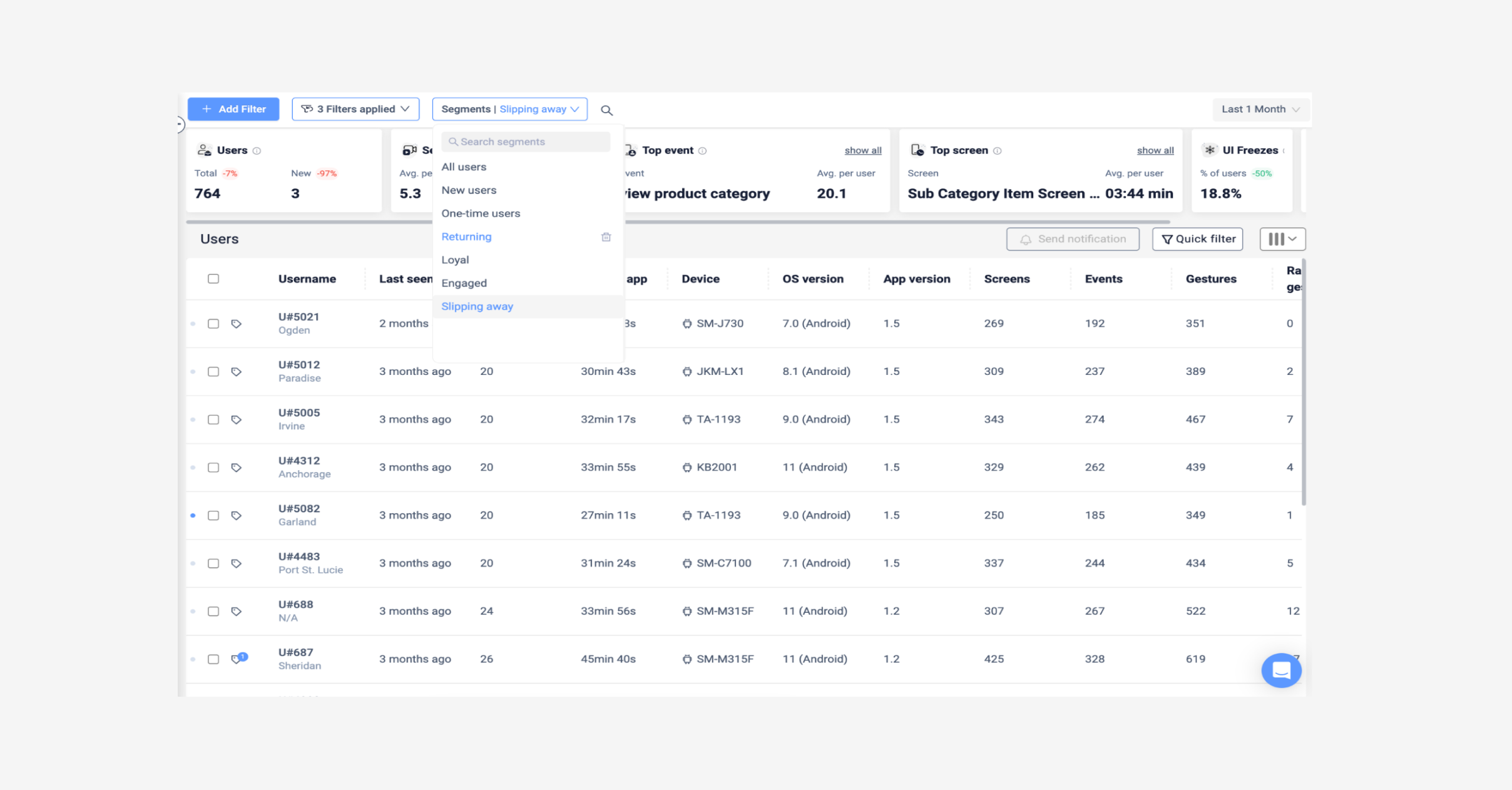 Por exemplo, suponha que você queira segmentar usuários que costumavam usar seu aplicativo com frequência, mas agora estão usando cada vez menos. Com a UXCam, é possível filtrar sua lista de usuários para identificar aqueles em "fuga". Com base nessa segmentação, você pode planejar uma estratégia de personalização para direcionar esses usuários. Uma opção é enviar a eles uma notificação push ou um e-mail personalizado, como o exemplo a seguir: "Oi, Pedro! Hora de aproveitar uma oportunidade! A Doggo Coin caiu 19% esta semana!" Essa mensagem demonstra personalização ao incluir o primeiro nome do usuário e um evento de ativação ao mencionar o recurso de negociação de ações do aplicativo. Quando o usuário responde ao evento de ativação e abre o aplicativo, você pode implementar uma tela de boas-vindas personalizada, dizendo algo como: "Bem-vindo de volta, Pedro!" Além disso, é recomendado configurar um relatório para rastrear o comportamento dos usuários que estavam se afastando. Esse relatório permitirá que você avalie a eficácia de sua estratégia de personalização ao longo do tempo.